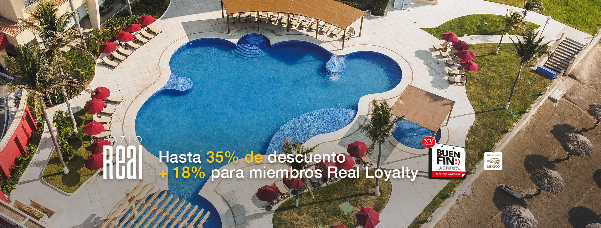 Mérida, Camino Real Monterrey, Camino Real Pachuca, Camino Real Polanco, Camino Real Pedregal, Camino Real Puebla Angelópolis, Camino Real Santa Fe, Camino Real Veracruz y Camino Real Zaashila Huatulco.Para los hoteles Real Inn aplica hasta un 25% de descuento: Real Inn Mexicali, Real Inn Nuevo Laredo, Real Inn Perinorte, Real Inn San Luis Potosí, Real Inn Tijuana y Real Inn Torreón.Promoción no válida para Quinta Real AcapulcoEl descuento se encuentra aplicado en la tarifa pública “Buen Fin”. Tarifa No Reembolsable. Tarifa en plan europeo (sin alimentos), persona extra con cargo adicional. No aplica con otras promociones y/o descuentos. Esta promoción no aplica para reservaciones de más de 10 habitaciones.Reservaciones al 800 90 123 00, en caminoreal.com y en nuestra aplicación móvil Camino Real Hoteles.Descuento por afiliación a Real LoyaltyAl afiliarse al programa de lealtad Real Loyalty, el cliente obtendrá un descuento adicional del 18% sobre la tarifa pública “Buen Fin”.Consulta hoteles y fechas disponibles en caminoreal.comFechas donde no aplica la promociónQuinta Real Aguascalientes: Del 13 al 18 de noviembre del 2025; del 11 al 30 de abril del 2026; del 01 al 17 de mayo del 2026. Quinta Real Guadalajara: Del 21 al 23 de noviembre de 2025. Quinta Real Huatulco: Del 28 al 29 de noviembre del 2025; del 28 al 31 de diciembre del 2025; del 01 al 03 y del 23 al 25 de enero del 2026; del 24 al 26 de abril del 2026.Quinta Real Oaxaca: Del 19 al 25 de diciembre del 2025; del 23 al 24 y del 30 al 31 de enero del 2026; del 27 al 28 de febrero del 2026; 13 de marzo del 2026. Quinta Real Puebla: Del 15 al 17 y 22 de noviembre del 2025; 24 y 31 de Diciembre del 2025; 24 de enero del 2026.Camino Real Acapulco: Del 19 al 21 de noviembre del 2025; del 28 al 31 de diciembre del 2025; 01 de enero del 2026; del 05 al 08 y del 23 al 28 de febrero del 2026. Camino Real Pachuca: Del 14 al 16 de noviembre de 2025. Camino Real Puebla Angelópolis: Del 14 al 16 y del 21 al 22 de noviembre del 2025; del 29 al 31 de enero del 2026. Camino Real Veracruz: Del 14 al 17 de noviembre del 2025; del 29 al 31 de diciembre del 2025; 01 de enero del 2026. Camino Real Zaashila Huatulco: Del 24 al 31 de diciembre del 2025; del 01 al 03 de enero del 2026.Real Inn Tijuana: Del 13 al 17 de noviembre del 2025